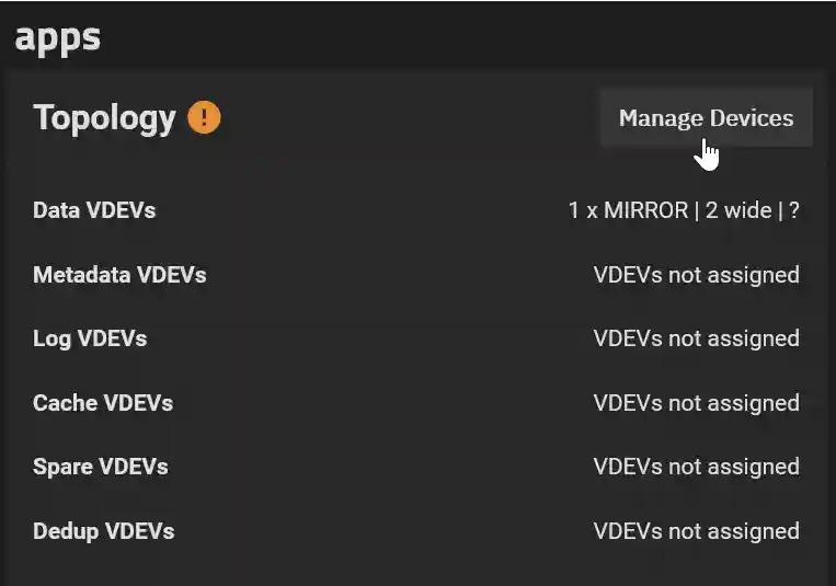 In the resulting Devices pane, the mirror is labeled as degraded. Click to the left of the VDEV (Mirror) to expose the disks: